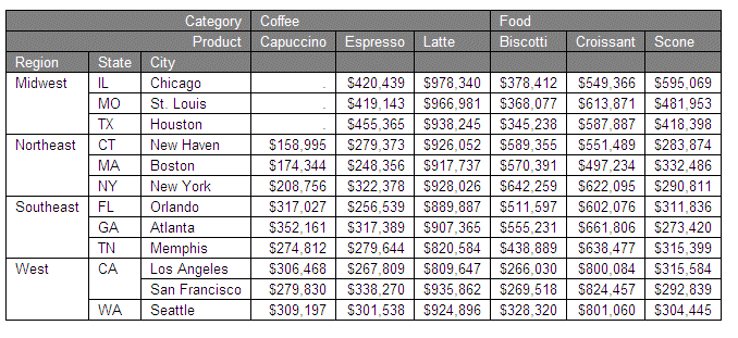 SET ACROSSTITLE=SIDE TABLE FILE GGSALES SUM DOLLARS/I8M AS '' BY REGION BY ST BY CITY ACROSS CATEGORY ACROSS PRODUCT WHERE CATEGORY EQ 'Coffee' OR 'Food'; ON TABLE SET PAGE-NUM NOPAGE ON TABLE NOTOTAL ON TABLE PCHOLD FORMAT HTML ON TABLE SET HTMLCSS ON ON TABLE SET STYLE * SQUEEZE=ON,UNITS=IN,ORIENTATION=PORTRAIT,$ TYPE=REPORT,FONT='ARIAL',SIZE=10,BORDER=LIGHT,$ TYPE=ACROSSTITLE,COLOR=WHITE, BACKCOLOR=GREY,$ TYPE=ACROSSVALUE,COLOR=WHITE, BACKCOLOR=GREY,$ TYPE=TITLE,COLOR=WHITE, BACKCOLOR=GREY,$ ENDSTYLE END