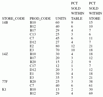 TABLE FILE SALES SUM UNIT_SOLD AS 'UNITS' AND PCT.UNIT_SOLD AS 'PCT,SOLD,WITHIN,TABLE' AND PCT.UNIT_SOLD WITHIN STORE_CODE AS 'PCT,SOLD,WITHIN,STORE' BY STORE_CODE SKIP-LINE BY PROD_CODE END