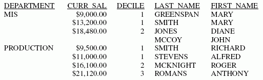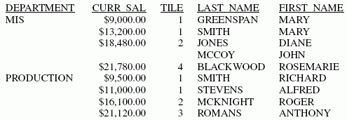 In this example, the employees with the three lowest salaries are listed and grouped into five tiles, but only the tiles that are in the top 3 (tiles 1, 2, or 3) are displayed in the report. Also, the heading for the TILES field has been renamed (using the AS phrase) to DECILES.