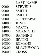TABLE FILE EMPLOYEE PRINT LAST_NAME FOR CURR_SAL 9000 TO 13500 OVER 14000 TO 19700 OVER 19800 TO 30000 END