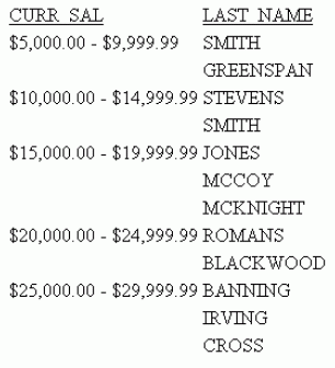 The following request displays employee salaries, but it groups them in an arbitrary way. Notice that the starting value of each range prints in the report.