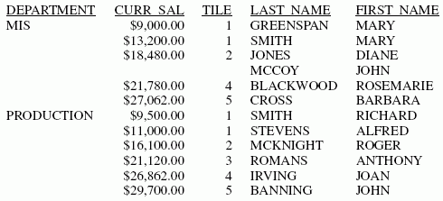 Note that the tiles are assigned within the higher-level sort field DEPARTMENT. The MIS category does not have any data assigned to tile 3. The PRODUCTION category has all five tiles.