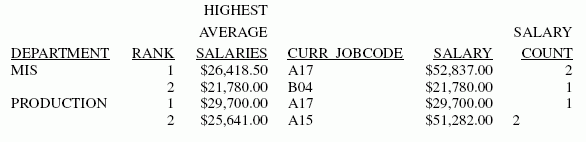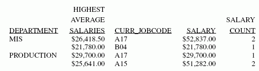 TABLE FILE EMPLOYEE SUM SALARY CNT.SALARY BY DEPARTMENT BY HIGHEST 2 TOTAL AVE.SALARY AS 'HIGHEST,AVERAGE,SALARIES' BY CURR_JOBCODE END