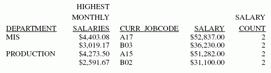 TABLE FILE EMPLOYEE SUM SALARY CNT.SALARY BY DEPARTMENT BY HIGHEST 2 TOTAL COMPUTE MONTHLY_SALARY/D12.2M=SALARY/12; AS 'HIGHEST,MONTHLY,SALARIES' BY CURR_JOBCODE END