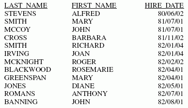 If you want to display a list of employees sorted by the date on which they were hired, but you want the report to contain last name, first name, and then the hire date in the third column, the following request is insufficient.