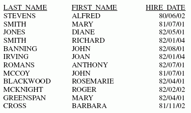 TABLE FILE EMPLOYEE PRINT LAST_NAME FIRST_NAME HIRE_DATE BY HIRE_DATE NOPRINT END