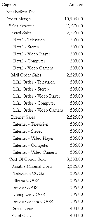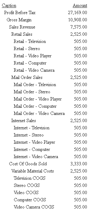 DATA 1000 R. + 1Profit Before Tax 2000 1000 R. + 2Gross Margin 2100 2000 R. + 3Sales Revenue 2200 2100 R. + 4Retail Sales 2210 2200 R7001+ 5Retail - Television 505.00 2220 2200 R7002+ 5Retail - Stereo 505.00 2230 2200 R7003+ 5Retail - Video Player 505.00 2240 2200 R7004+ 5Retail - Computer 505.00 2250 2200 R7005+ 5Retail - Video Camera 505.00 2300 2100 R. + 4Mail Order Sales 2310 2300 R7011+ 5Mail Order - Television 505.00 2320 2300 R7012+ 5Mail Order - Stereo 505.00 2330 2300 R7013+ 5Mail Order - Video Player 505.00 2340 2300 R7014+ 5Mail Order - Computer 505.00 2350 2300 R7015+ 5Mail Order - Video Camera 505.00 2400 2100 R. + 4Internet Sales 2410 2400 R7021+ 5Internet - Television 505.00 2420 2400 R7022+ 5Internet - Stereo 505.00 2430 2400 R7023+ 5Internet - Video Player 505.00 2440 2400 R7024+ 5Internet - Computer 505.00 2450 2400 R7025+ 5Internet - Video Camera 505.00 2500 2000 E. - 3Cost Of Goods Sold 2600 2500 E. + 4Variable Material Costs 2610 2600 E7101+ 5Television COGS 505.00 2620 2600 E7102+ 5Stereo COGS 505.00 2630 2600 E7103+ 5Video COGS 505.00 2640 2600 E7104+ 5Computer COGS 505.00 2650 2600 E7105+ 5Video Camera COGS 505.00 2700 2500 E7111+ 4Direct Labor 404.00 2800 2500 E7112+ 4Fixed Costs 404.00 3000 1000 E. - 2Total Operating Expenses 3100 3000 E. + 3Selling Expenses 3110 3100 E. + 4Advertising 3112 3110 E7202+ 5TV/Radio 505.00 3114 3110 E7203+ 5Print Media 505.00 3116 3110 E7206+ 5Internet Advertising 505.00 3120 3100 E7212+ 4Promotional Expenses 404.00 3130 3100 E7213+ 4Joint Marketing 404.00 3140 3100 E7214+ 4Bonuses/Commisions 404.00 3200 3000 E. + 3General + Admin Expenses 3300 3200 E. + 4Salaries-Corporate