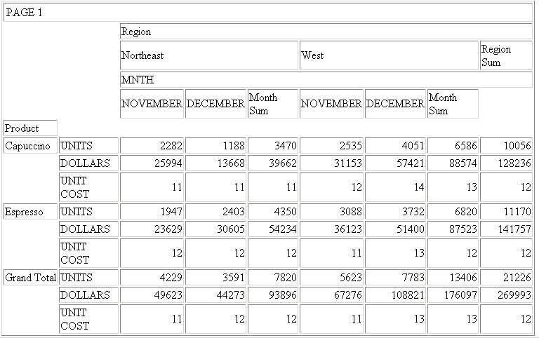 DEFINE FILE GGSALES MNTH/MTr = DATE; END TABLE FILE GGSALES SUM UNITS/I5 AS 'UNITS' OVER DOLLARS/I6 AS 'DOLLARS' OVER COMPUTE DOLLPER/I6 = DOLLARS/UNITS; AS 'UNIT COST' BY PRODUCT ACROSS REGION RECOMPUTE AS 'Region Sum' COLUMNS 'Northeast' AND 'West' ACROSS MNTH RECOMPUTE AS 'Month Sum' COLUMNS 'November' AND 'December' WHERE DATE FROM '19971101' TO '19971231'; WHERE PRODUCT EQ 'Capuccino' OR 'Espresso'; ON TABLE SUMMARIZE AS 'Grand Total' END