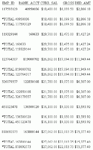 TABLE FILE EMPLOYEE SUM CURR_SAL AND GROSS AND DED_AMT BY EMP_ID BY BANK_ACCT WHERE BANK_ACCT NE 0 ON BANK_ACCT SUB-TOTAL ON TABLE NOTOTAL END