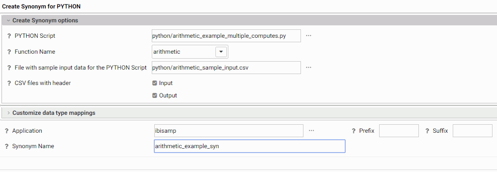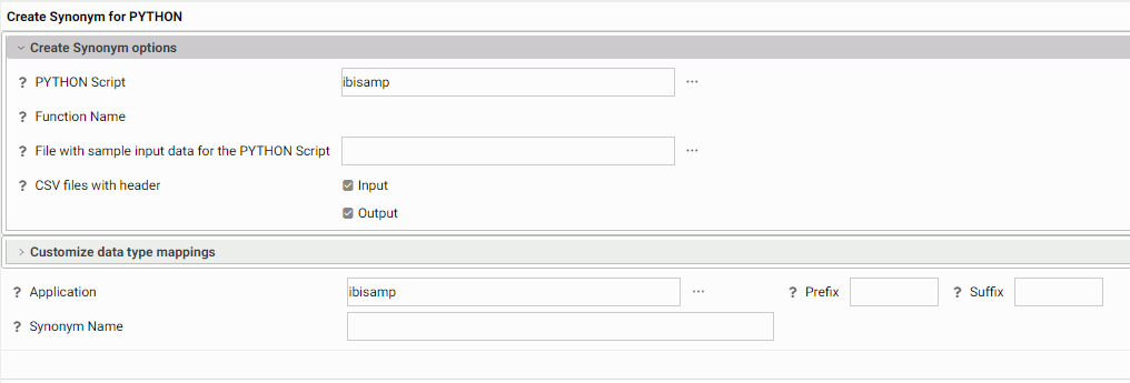 The synonym will be created using a sample file that contains only the fields that are input parameters for the script. A few rows of sample data are sufficient for the Adapter for Python to determine the appropriate data types and lengths of the parameters. The sample file must be a .csv file. The data in the file does not have to contain actual data, but it should represent the highest values for numeric fields and the longest lengths for alphanumeric values that will appear the actual data. The Master File will contain the list of input fields and output fields. The Access File will contain information about the script file and sample input file.