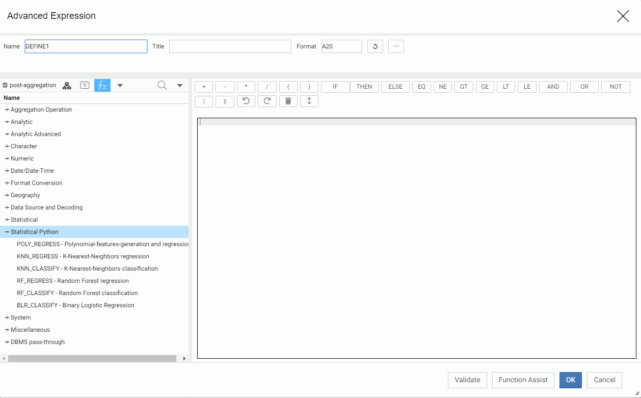 In the Reporting Server Synonym Editor, these functions are available when you create an expression. Right-click a measure field, point to New Expression, and click Apply Function or Advanced Expression. Click post-aggregation to gain access to the Python Statistical functions, as shown in the following image.